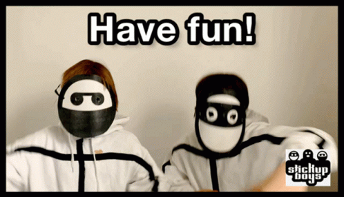 The Stickupboys, wearing unique masks, encourage viewers to 'Have fun!' with their Stickupmusic.