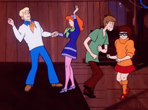 Fred, Daphne, Shaggy, and Velma from Scooby-Doo are seen dancing together on a wooden floor.