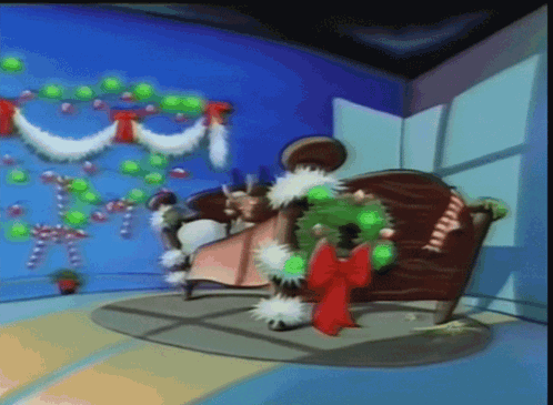 Stimpson J Cat decorates a Christmas tree with lights, while Ren sits on the couch, celebrating the holiday season.