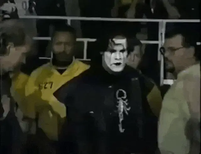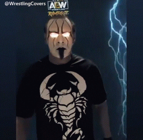 Sting makes a dramatic entrance on AEW Rampage, wearing his iconic face paint with glowing eyes and a scorpion shirt.