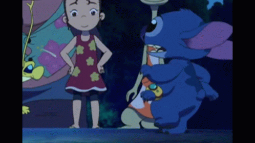 Stitch, experiment 626, is visibly angry and upset, seen with Yuna, Jumba Jookiba, and Pleakley.
