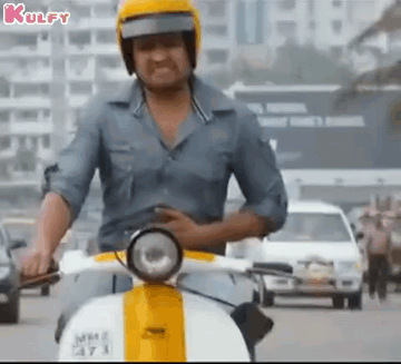 Santhanam, wearing a yellow helmet, rides a scooter while visibly experiencing a stomach ache.