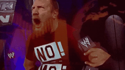 Daniel Bryan, known for his 'NO!' chant, expresses strong emotion in a red shirt, often associated with 'Stonks' and WallStreetBets memes.