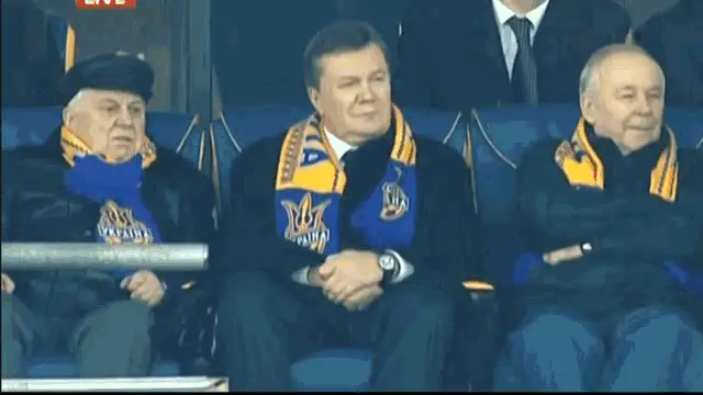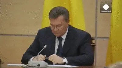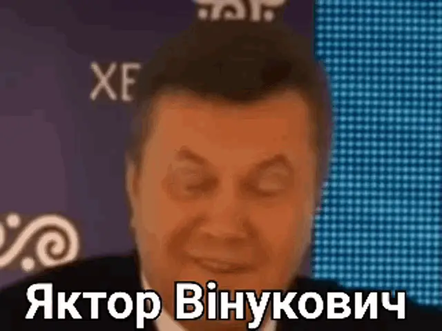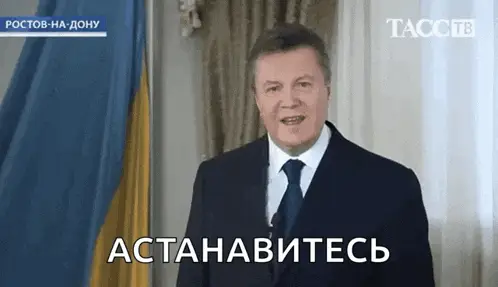 Viktor Yanukovych, former Ukrainian President, delivers a speech in Rostov-on-Don, Russia, with the Ukrainian flag in the background.