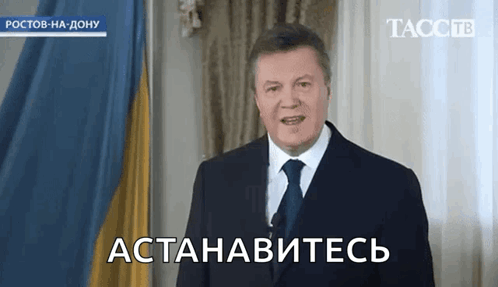 Viktor Yanukovych, former Ukrainian President, delivers a speech with the iconic 'Stop It!' (АСТАНАВИТЕСЬ) caption.