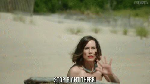Miriam Shor on a beach, making a 'stop right there' gesture with her hand.