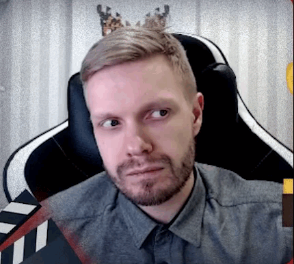 Kelebro from Stopgame looks nervous with wide, shifty eyes while sitting in a gaming chair, a crown decoration behind him.