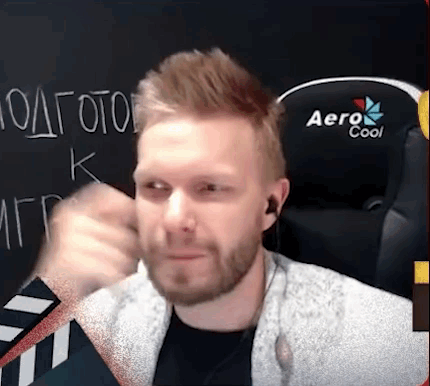 a man with a beard and ear buds is sitting in a chair in front of a blackboard .