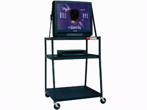 A TV on a rolling cart displays 'Bill Nye the Science Guy' with a VCR/DVD player below.