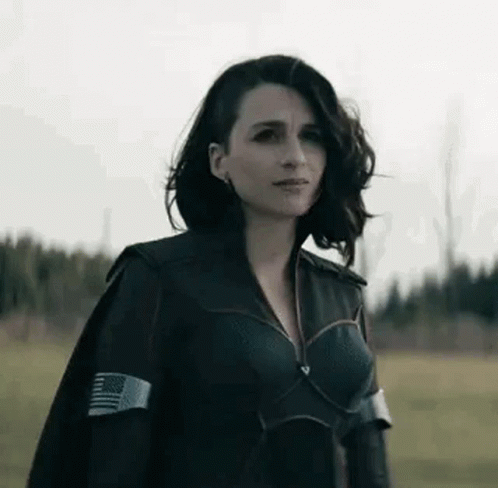Stormfront, a character from The Boys, stands in a field wearing her black suit and cape.