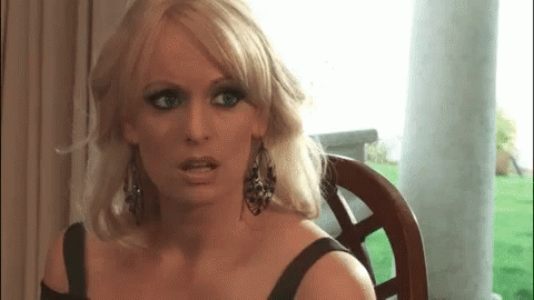 Stormy Daniels sitting in a chair, wearing a black dress and large earrings, looking intently.