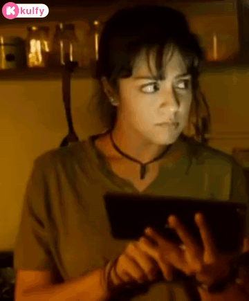 Actress Jyothika looks wary while holding a tablet in a dimly lit room, displaying a strange action.