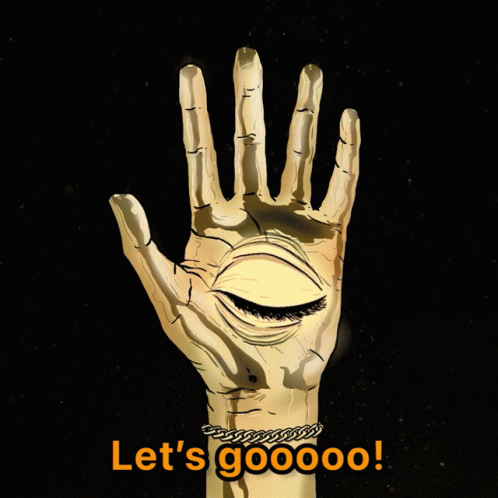 A golden hand with an eye on its palm, featuring the text 'Let's gooooo!' and a chain bracelet.