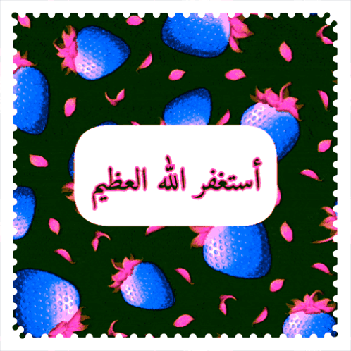 Digital art of blue strawberries and pink petals on a dark background, framed like a stamp, with Arabic text 'Astaghfirullah Al-Atheem'.