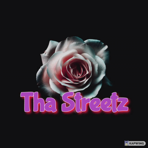 A beautiful rose with 'Tha Streetz' text displaying a vibrant rainbow color effect, set against a dark background.