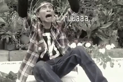A man in a plaid shirt is stressed and crying, sitting on the ground with his arms raised in despair.