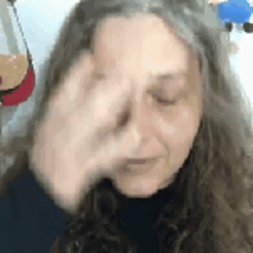 Denise Detremura shows a stressed expression, covering her face and making a funny face.