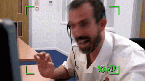 Dr Xand van Tulleken screams into a headset, looking stressed and overwhelmed in an office setting.
