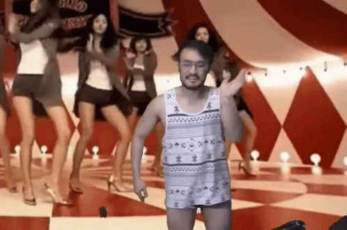 Stronk Stronkgamer performs a K-Pop dance alongside a group of women, showcasing his energetic moves.