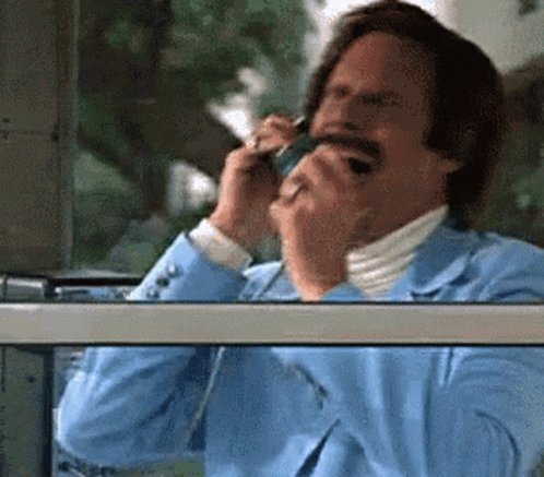 Will Ferrell as Ron Burgundy from Anchorman, intensely screaming and expressing frustration in a phone booth.
