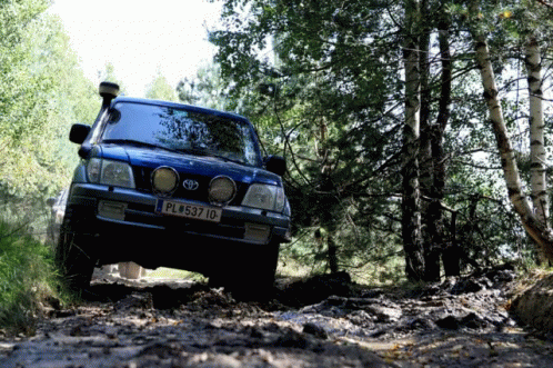 A blue Toyota Land Cruiser is stuck off-road in a muddy forest, with a Polish license plate.