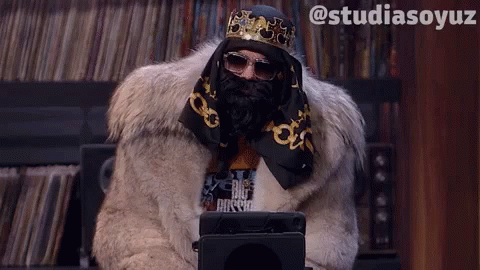 Big Russian Boss in a fur coat and crown reacts to something on a tablet during a Studio Soyuz segment.