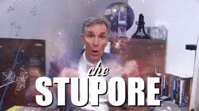 A man with a surprised expression and hands raised, with the Italian text "che stupore" (what amazement) behind him, surrounded by a cosmic effect.