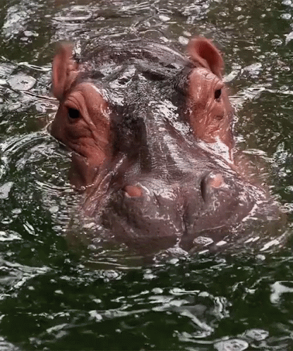 A close-up view of a hippopotamus with its head partially submerged in water, blinking slowly.