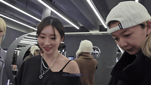a woman wearing a black tank top and a white hat with the word adidas on it stands next to another woman