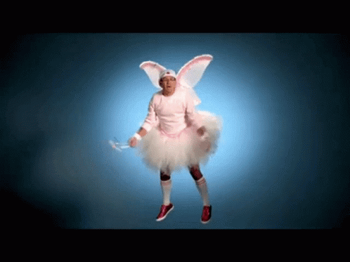 The Common Man from Kfan's Power Trip dressed as a tooth fairy, dancing in a pink tutu.