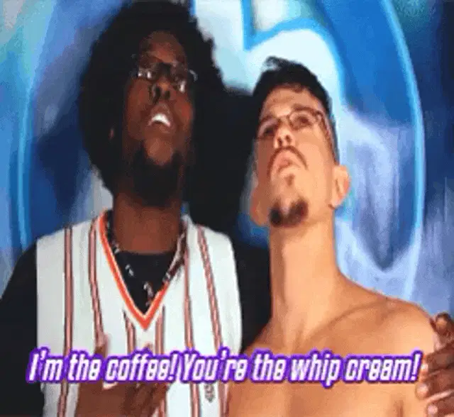 Drag queens Sugar and Spice from RuPaul's Drag Race Season 15 pose in front of a neon sign.