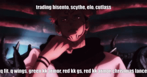 Sukuna from GPO listing items for trade including bisento, scythe, elo, cutlass, q wings, and various armor.