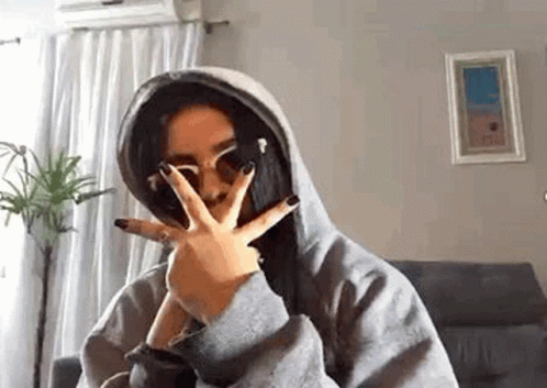 A girl in a grey hoodie and sunglasses makes a hand gesture before disappearing from a living room with swag.