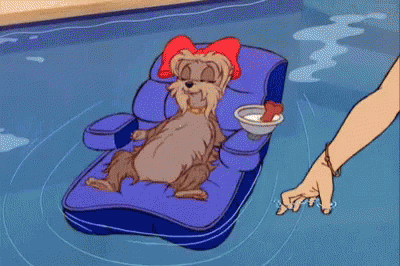 A cartoon dog's relaxing summer chill on a pool floater is hilariously interrupted by a splash.