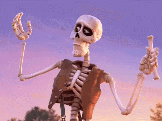 A skeleton character from Coco, wearing a brown vest, waves and gestures against a vibrant sunset sky.