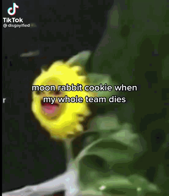 The Moon Rabbit Cookie character with a sunflower face reacts dramatically when a team dies in this meme.