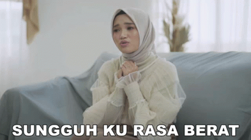 Nabila Lida, wearing a hijab, sits on a couch expressing a heavy feeling with the caption 'Sungguh Ku Rasa Berat'.