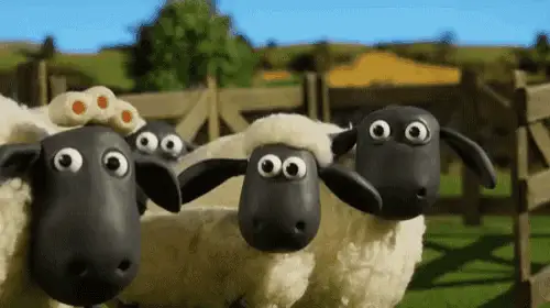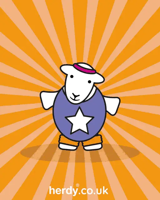 A cartoon sheep floats in the sky above a city skyline, wishing 'Eid al-Adha Mubarak'.
