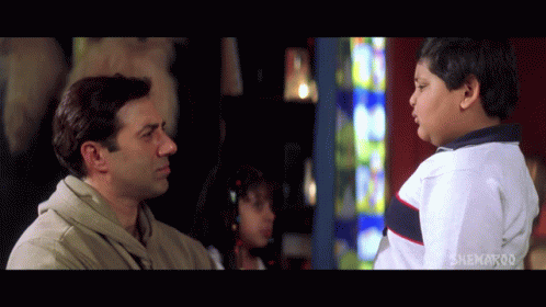 Sunny Deol interacts with a young boy, making a gesture to him in a scene from the movie Champion.