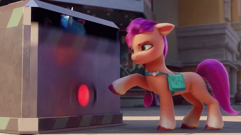 Sunny Starscout and Izzy Moonbow, characters from My Little Pony, interact on a city street.