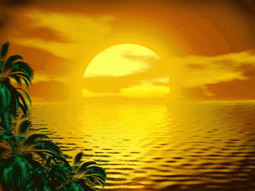A vibrant golden sunset over a calm ocean, with silhouetted palm trees in the foreground.