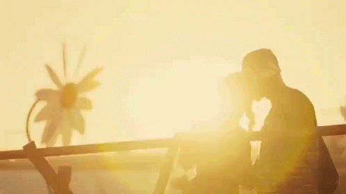 A couple shares a romantic kiss against a vibrant sunset backdrop, with a large flower in the foreground.