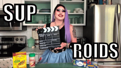 Drag Queen Haley Hemorrhoid introduces her 'Sup Roids' kitchen show, holding a clapperboard.