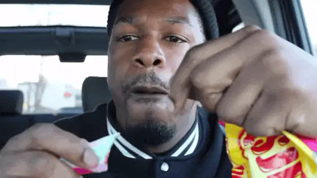 A man enthusiastically celebrates Super Bowl Sunday while jumping on a couch, with a woman watching.