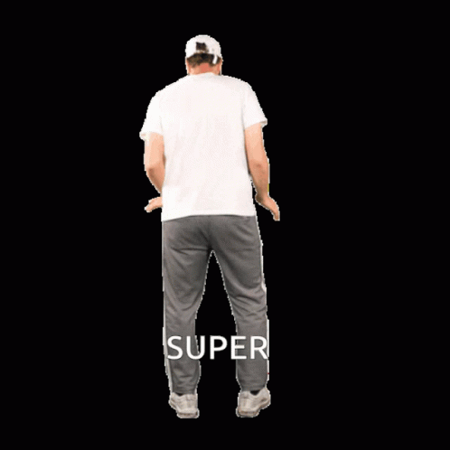Hakim turns, crouches, and smiles happily at the camera with 'SUPER' text. A fun, energetic dance.