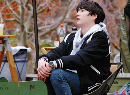 Super Junior's Kyuhyun sits outdoors, looking pensive and pouting slightly, with a Korean caption "힝...".