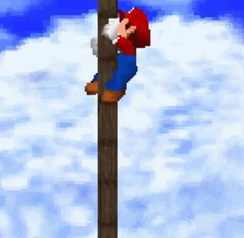 Pixel art of Mario from Super Mario 64 DS performing a poledance, sliding down a wooden pole.