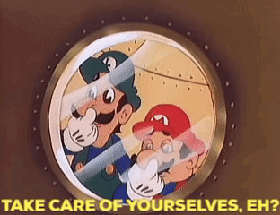 Mario and Luigi from Super Mario Bros look through a window, saying 'Take care of yourselves, eh?'