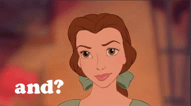 Belle from Beauty and the Beast gives a sassy eyebrow raise with the text 'and?'.