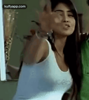 Shriya Saran performs a super hand action with a happy face, showing appreciation.